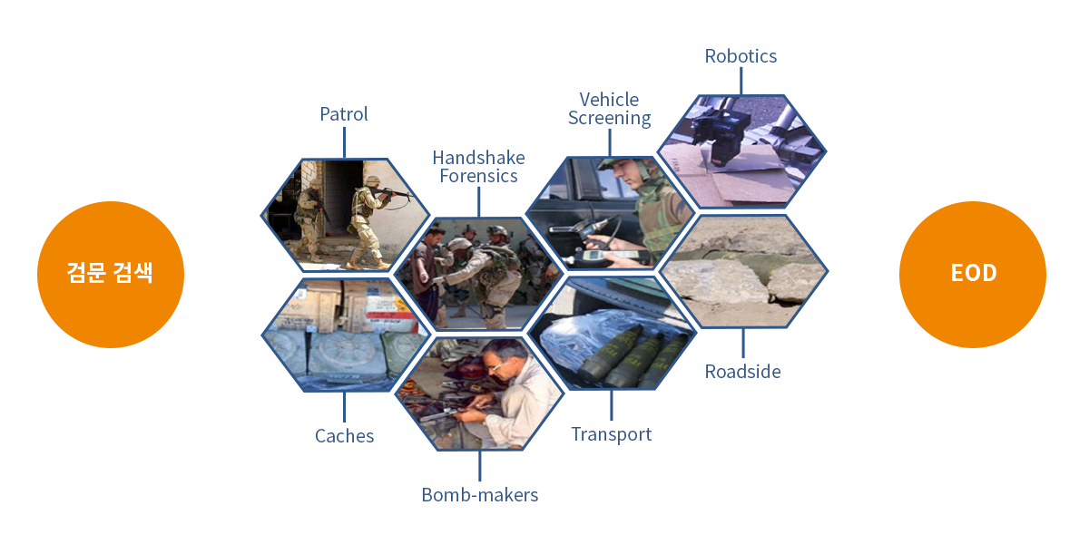 탐지 개인용으로 휴대가 편리하고, 조작이 간편하며, 한글 메뉴를 지원합니다. 폭발물의 제조, 운반, 설치에 관련된 사람을 신속하고 정확하게 탐지할 수 있는 피코그램이며 단위의 매우 높은 탐지 감도와 정확성이 필요합니다. 폭발물질 분석시간 및 재 탐지를 위한 준비시간을 최소화합니다. 또한 광범위한 범위의 폭발물질을 탐지할 수 있습니다. 운용 지원 및 유지보수 또한 신속합니다.